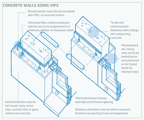 Abley will be sandwiching VIPS within reinforced concrete panels. The aim is a U value so low – 0.1W/m2 K – it will make the Building Reg targets look hugely unambitious. To achieve that performance with fibre or foam concrete panels would require around 300mm, but a VIP can do it in just 25mm, claims Abley.