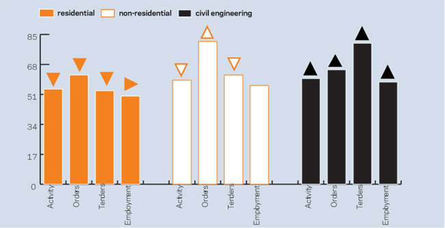 The current strength of order levels and tender enquiries is instrumental to our projection and reflects respondents’ optimism about the future. The indices use a base level of 50 – values above that level indicate an increase, below that a decrease.
