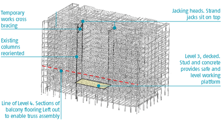Using this method meant that assembly of the truss structure could start as soon as level three was in place. Once the main steel structure reached roof level, the contractor could jack the truss structure into place straight away. As the floors were already decked, the concrete floor could then be poured, releasing the area for the 13th-floor plant room.