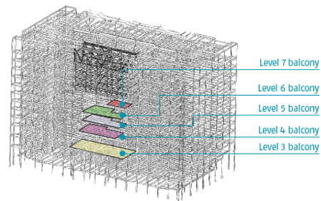Erect balcony steel, which had been left out around the edges of the atrium between floors 5 to 9; complete remaining roof steel at the same time. 1 week (see graphic to left)