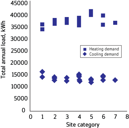 Figure 6 clarifies the effect of site on total load demand (heating and cooling) and shows a line of the mean values for each site category. This illustrates that the average total load demand peaks at category five sites and falls either side of this, and that there is residual variation unexplained by site categorisation alone. The other main factor is radial distance from the centre of a city.