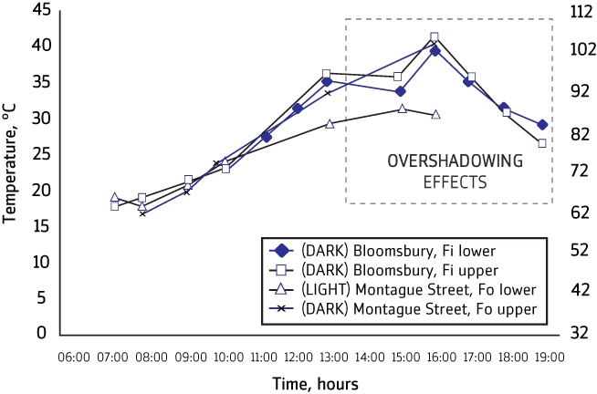Taken together, this suggests that the peak gorge air temperature could have been reduced 3-4°C on the sunny day if all surfaces had been a matt white colour rather than predominantly almost black. For the lowest surface temperature, and, therefore, air temperature, a facade needs high solar reflectivity and high infrared emissivity. Caution, however, is needed when choosing very reflective surface finishes as these may produce glare.