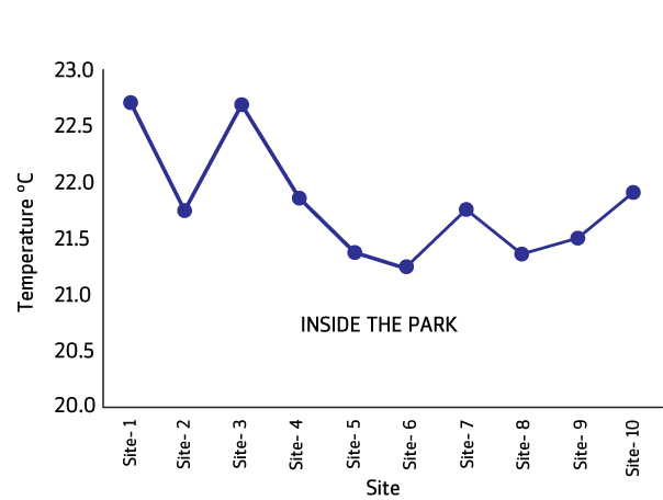 The air temperature clearly reduces inside the park and, in line with the wind direction, the cooler air from the park appeared to be cooling the street gorge directly beyond the park (sites 9 and 10) for a distance of 200m to 400m. (Site 7 was anomalous and the reason was not clear.) Similar cooling effects of vegetation have been reported in many other cities, including Gothenburg and Mexico City.