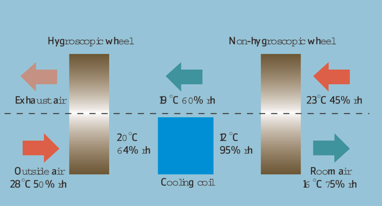 The system works using two thermal wheels, one hygroscopic and one non-hygroscopic, as well as a cooling coil .