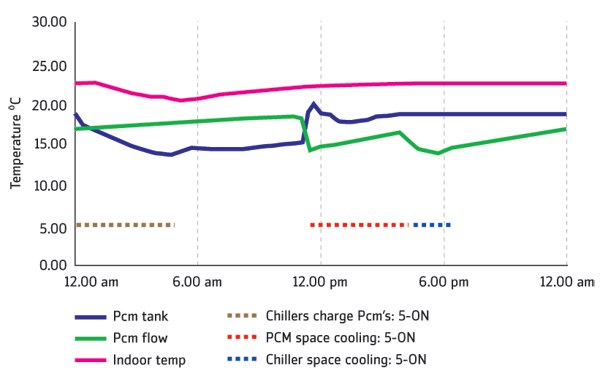 Consequently, the thermal mass of the building (cooled overnight to 21ºC) runs out of cooling capacity at about midday, at which point the phase-change tanks supply chilled water to the chilled ceiling panels until 4.30pm when they are exhausted, whereupon the chillers kick in to finish the day (see figure 1).