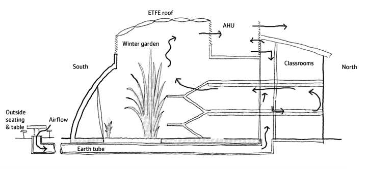 Cross-section through the school to show the ventilation paths