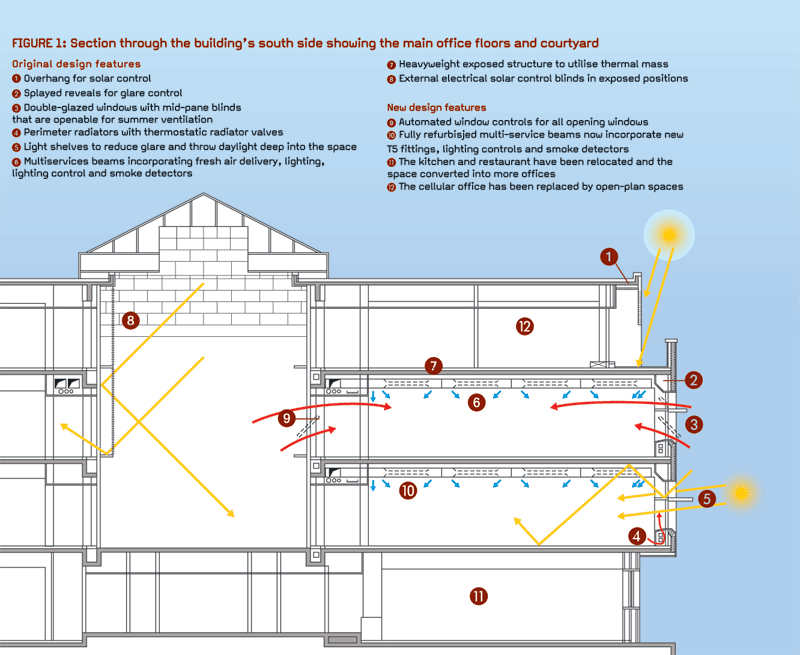 The offices surround three internal courtyards which, as well as bringing light to the floors, allowed cross-ventilation. Although the depth of the floorplates (14 m) pushed the limits for natural ventilation, Vince says the real issue was that internal loads from office equipment and lighting were higher than the original designers envisaged. Having said that, the HBS team felt that the original design strategy should have been up to the job. “All the ingredients were there – the exposed concrete slabs, the natural cross-flow ventilation and night-time cooling strategies. It just wasn’t operated as it should have been,” says Vince.