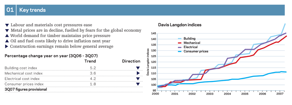 Davis Langdon's cost indices track movements in the input costs of construction work in various sectors, incorporating national wage agreements and changes in materials prices as measured by government index series. They provide an underlying indication of price changes and differential movements in the various work sectors, but do not reflect changes in market conditions affecting profit and overheads provisions, site wage rates, bonuses or materials price discounts and premiums. Market conditions are recorded in Davis Langdon’s quarterly market forecast (last published 7 September).