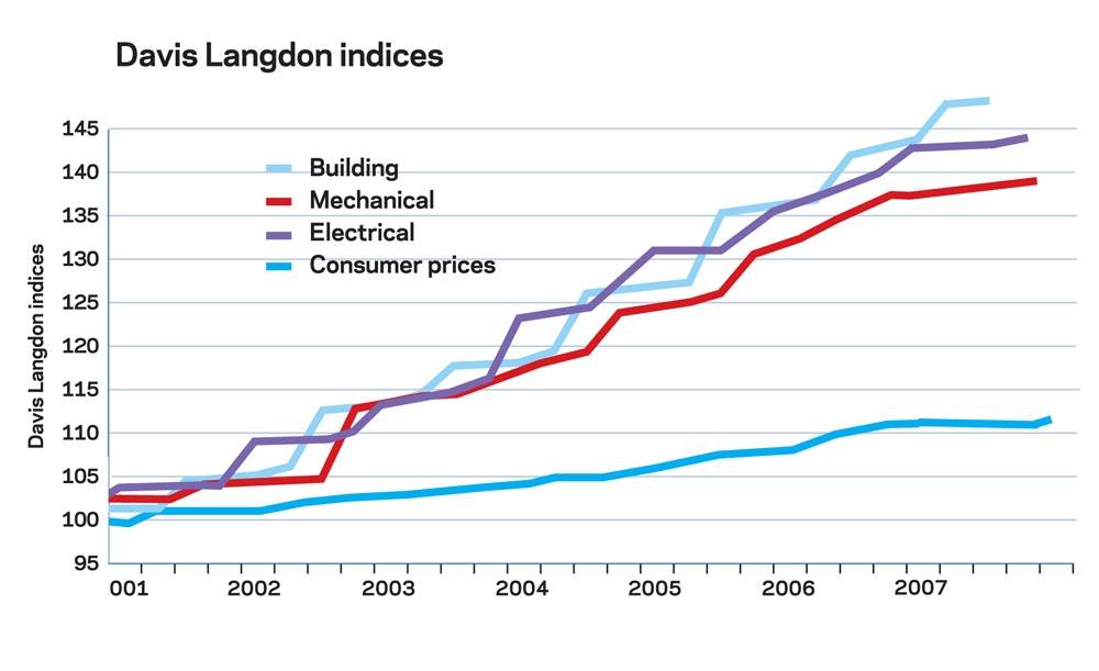 Davis Langdon’s cost indices track movements in the input costs of construction work in various sectors, incorporating national wage agreements and changes in materials prices as measured by government indices. They provide an underlying indication of price changes and differential movements in various work sectors but do not reflect changes in market conditions affecting profit and overheads provisions, site wage rates, bonuses or materials’ price discounts and premiums. Market conditions are recorded in Davis Langdon’s quarterly market forecast (last published 1 February).