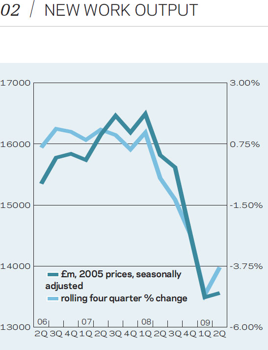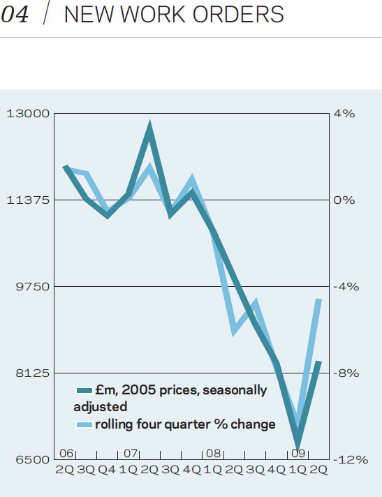 In the first six months of 2009, construction output fell to £47.8bn, 15% less than a year earlier. However, in the second quarter, output declined by just 0.5%, quarter-on-quarter. Orders in the first half of the year totalled £15.1bn, in 2005 prices, which was a decline of almost 27% on the same period of 2008. Again, there were some positive signs from the second quarter figures, with new orders at £8.5bn, 22% higher than in the first quarter of the year.