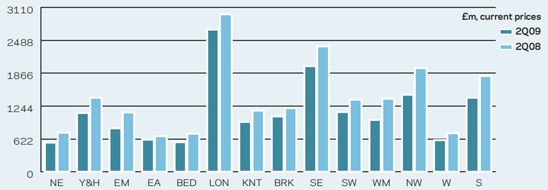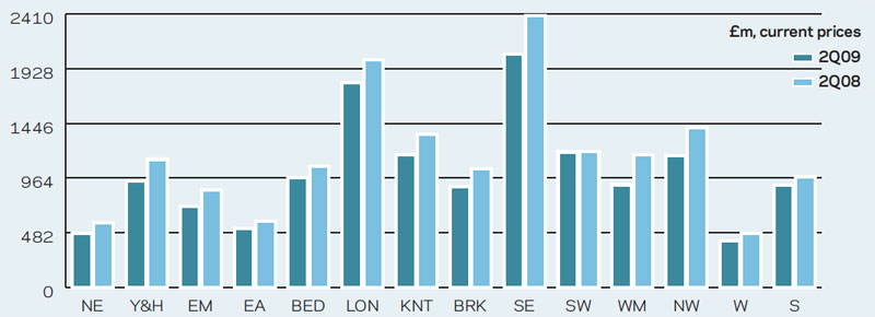 New work output continued to fall across all regions in the second quarter of 2009 and all, bar EA and LON, saw double-digit drops from the same period of 2008. The strongest decline was in WM (-28.9%), followed by EM (-26.6%) and declines of 25.7% and 25.6% in NW and NE, respectively. In contrast, EA experienced a fall of just 9.5%, while new work output in LON was 9.6% lower. With the exception of NW, rates of contraction eased from 1Q09.