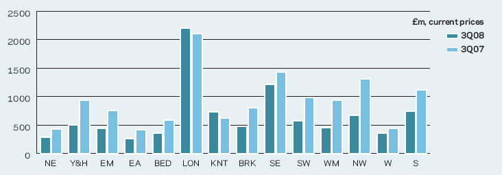 The industrial sector was another that was hit hard by the deteriorating economic conditions – output declined by 19% year-on-year in 2008 and new orders were 27% lower. The very bleak outlook for the manufacturing sector, despite the weakening pound, means capital investment here continues to look unlikely and industrial construction is set to contract further.