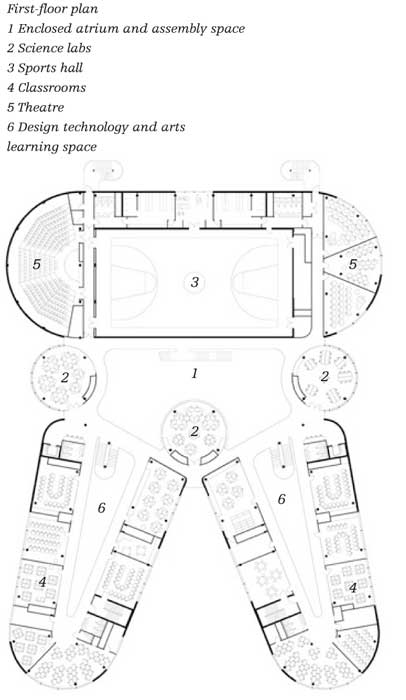 The rest of the building follows earlier Foster academies, from the elegant exterior, which is a smaller, timber clad version of the practice’s Thomas Deacon academy in Peterborough, to the two “fingers” housing other classrooms. There is also an area that can be shut off from the rest of the school so it can be used by the community after hours. This contains a performance space, gym and restaurant.