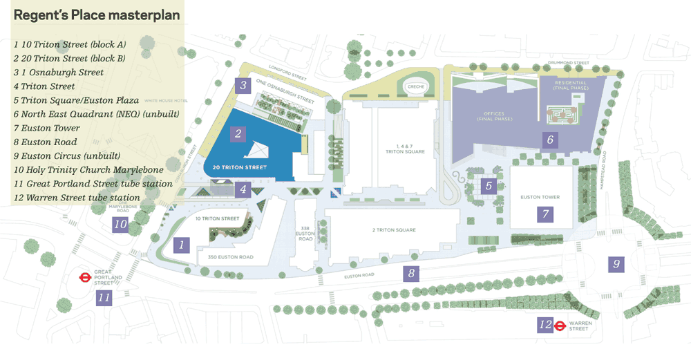 Regent’s Place is owned by British Land, a developer with significant holdings and experience in the London commercial property market. It occupies a 13-acre site on the northern side of Euston Road that was formerly the site of a kiln and light industrial buildings owned by the Crown Estate; its most prominent landmark is the 36-storey Euston Tower on its south-eastern corner.