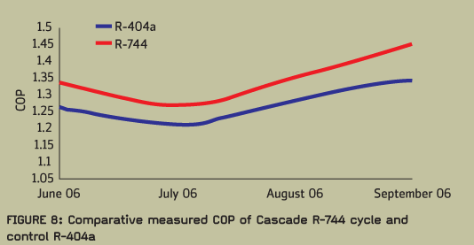 After a year of operation the performance of the systems was compared against a like-for-like HFC system installed as a control. As can be seen in figure 8, the R-744 cascade low temperature system shows a better COP compared with the HFC control.
