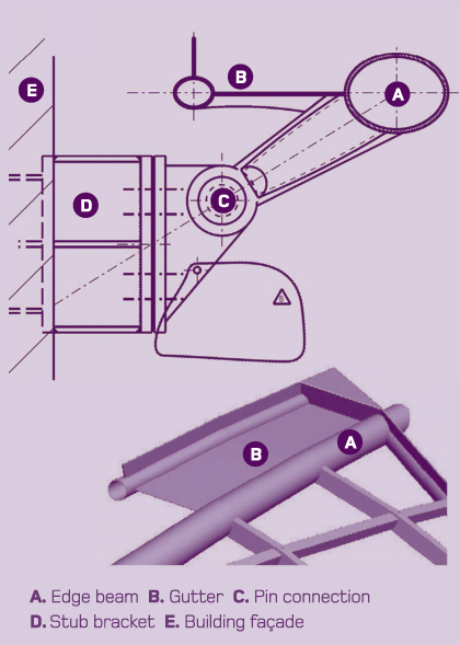 The 10 roofs include a total of over 2,800 individually sized, 17.53mm-thick panes of laminated glass and around 300 tonnes of steelwork. Resolving the huge forces generated by these loads without the use of columns was achieved via edge beam gutter details along the sides of the roof panels, which in turn transfer loads on to armatures fastened into the building façades.