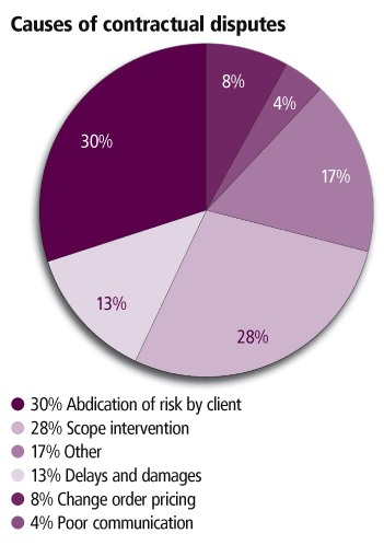 And when it comes to the causes of disputes, the survey found that contractors blamed pressure from clients above anything else (see chart, left). It seems that clients assume when signing a contract that they no longer need to be involved in managing project risk. One executive from Australia said: “I think the biggest cause is an abdication of ‘issues management’ by the client and dependence on a contract that supposedly transfers all risks to the contractor”.