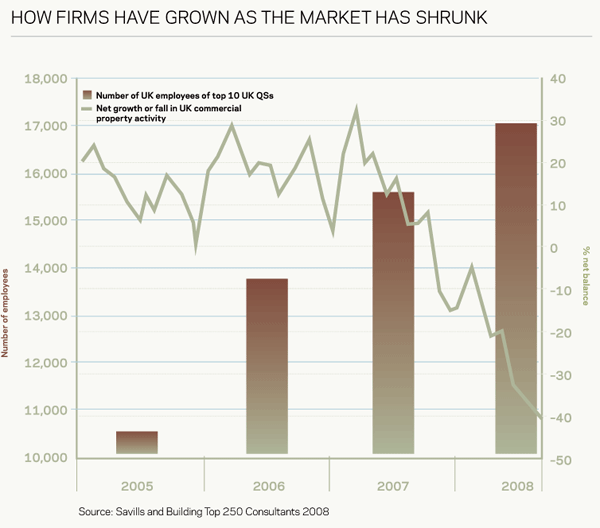 Despite its negative effects, Sayer sees the downturn as an opportunity for Baqus. The firm is keen to make acquisitions and claims that it has the funds to do so after its flotation on the stock market last year. He says: “A lot of medium-sized QSs have big overdrafts and are saying it is a good time to start talking.
