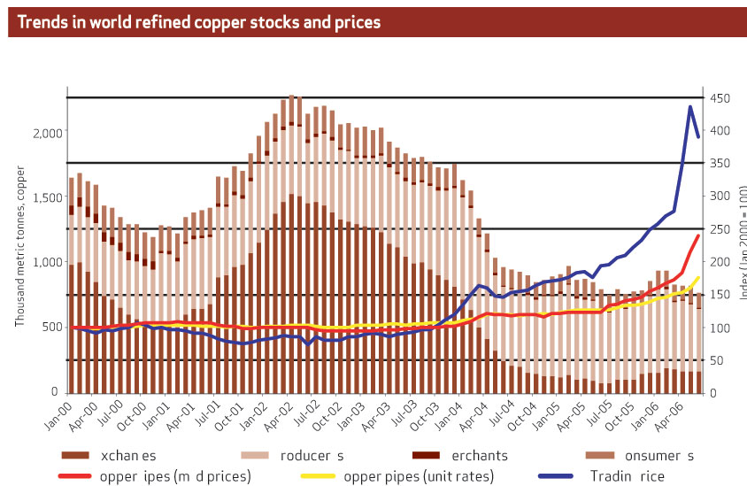 The graph (see below) highlights the world refined copper stocks against the movement of copper trading prices on the London Metal Exchange (LME), and both the cost of construction of copper pipes and the complete cost of supply and fix. This shows that a rise in the price of the base metal is inevitably followed by an increase in the factory gate price of copper pipe.