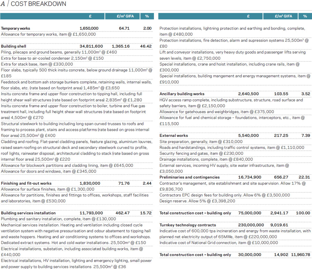 The cost model provides outline costs of the building facilities associated with a 600,000 tonne a year combustion plant based on a three-line moving grate technology. The analysis also provides indicative costs of the combustion system and the grid connection. Details of the scope of external works are included as these are a critical element of the operation of the facility.
