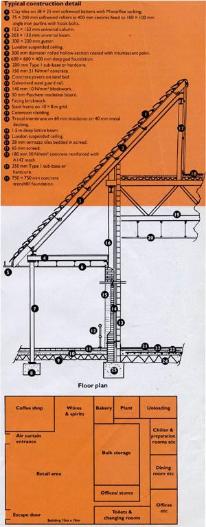 The traditional vernacular facade - facing brick and a pitched tile roof - is still in vogue. But in future, retailers might be tempted to develop shed / warehouse supermarkets in an effort to further cut costs. Running contrary to these economies is the definite trend for providing a totally controlled “pressurised” internal environment and “air curtain” entrances instead of four-leaf or revolving doors. This move requires greater care during construction to ensure that buildings are fully sealed, particularly around the loading bay areas. But there is little indication that the requrement for a fully sealed building is reflected by and increase in price for the extra labour content.