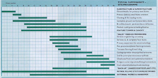 Once the weather is excluded, starts can be made on the ground slab and to the subfloor mechanical and electrical services to the sales area. Because the areas involved are so vast, trades can overlap in different parts of the building. The brickwork and windows then become critical in order to complete the enclosure of the building, thus enabling a start to be made on the finishes to the sales area. Once the fabric, services installations and main finishes to the sales areas are in place, fitting-out the supermarket with the necessary special equipment becomes the priority. This work is integrated into the master programme and is expected to be accommodated within the overall contract period. Testing and commissioning of all installations must be proven prior to handover; however, balancing the systems often continues well after occupation.
