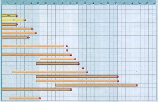 <B>Programme 3</b> shows the lead-in periods for the major works packages and is broken down into critical categories, starting with tender documentation and running through to manufacture. The procurement programmes for some of the more complex and work-intensive packages are itemised under these categories, while other more routine activities can be dealt with by a simple lead-in time. The summary results of these are interpolated and transferred on to Programme 1 to demonstrate their effect on the design programme. The combination of Programmes 1 and 3 represents the major design programme and shows how extensive the overlapping of design and on-site activity can become.