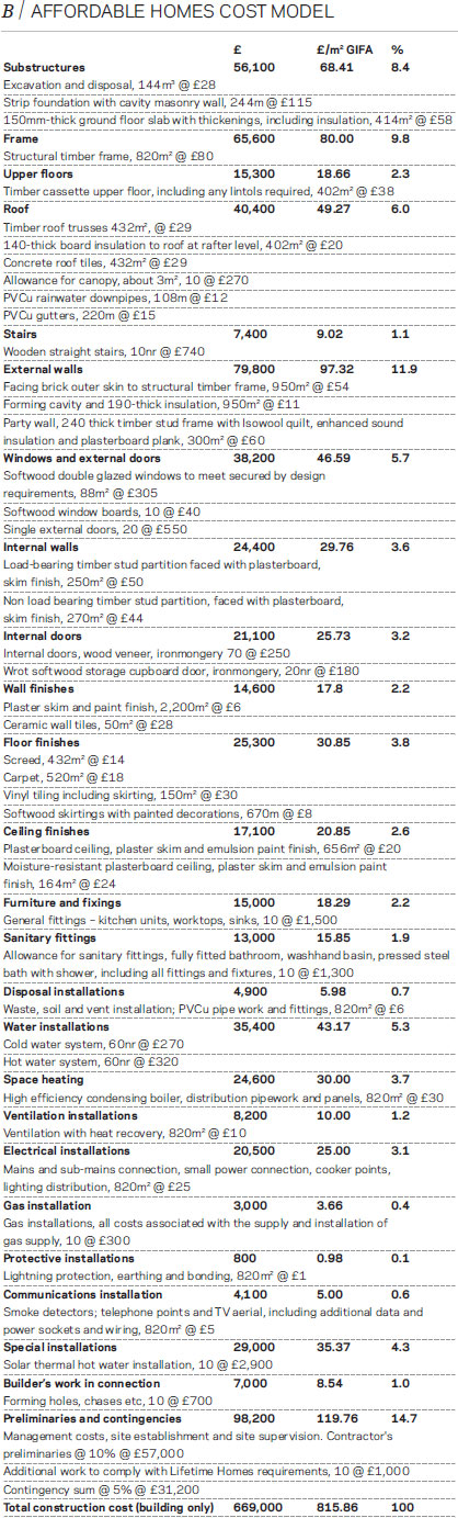 The cost model is based on a new-build scheme containing a mix of two and three-bedroom houses. The buildings comply with level four of the Code for Sustainable Homes, are of a timber-frame construction with a reinforced insitu concrete ground slab, facing brick external walls and concrete tiles on timber roof trusses. The softwood doors and windows are painted and internal subdivision is by loadbearing timber stud partition. Features for the Lifetimes Homes standard are also included.