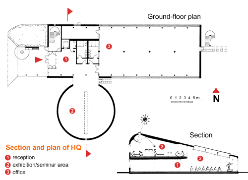 The emphasis is on efficient planning, with a simple plan and cross-section. One of the first decisions was to express in architectural form the two parts of the building: the offices and the exhibition and seminar space. The offices are contained in a long rectangular block, with the exhibition and seminar area in a circular building facing the entrance. Exhibitions will extend outside and the outside area includes a timber crop that will supply a wood-burning boiler in the future.