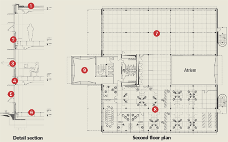 </b>The building has fully integrated the use of daylight, natural ventilation, high levels of insulation and thermal mass to achieve a BREEAM “very good” rating. Only the lack of public transport close to the site prevented the scheme from being awarded an “excellent” rating. These factors and the use of highly efficient gas-fired boilers and heat-recovery devices also help to minimise emissions of carbon dioxide.