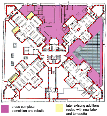 The exterior design was discussed in some detail with English Heritage, local authority conservation staff and local conservation groups. Parameters were established, including the demolition of many later additions to the building, such as the rear service areas, and agreeing a strategy for recladding other “post-Waterhouse additions” with new brick and terracotta to match the original design.