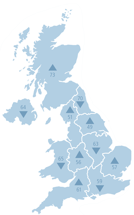 In central regions Northern Ireland, Wales, and the East Midlands' indicators declined four points, one point and four points respectively. But essentially, all stood significantly higher than 50. The West Midlands recorded the sole rise in the central region. Its indicator gained two points, raising it to 56.