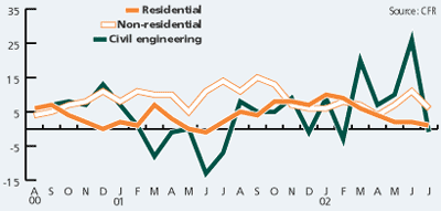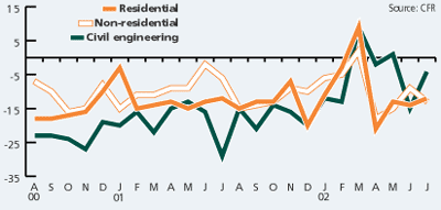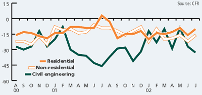 Construction Forecasting and Research's previous survey, published on 30 August, suggested that large firms and those operating in the civil engineering sector were the most likely to experience a slowing in activity, and this is confirmed by this month's results. Their balances have declined by 48 and 16 percentage points respectively.