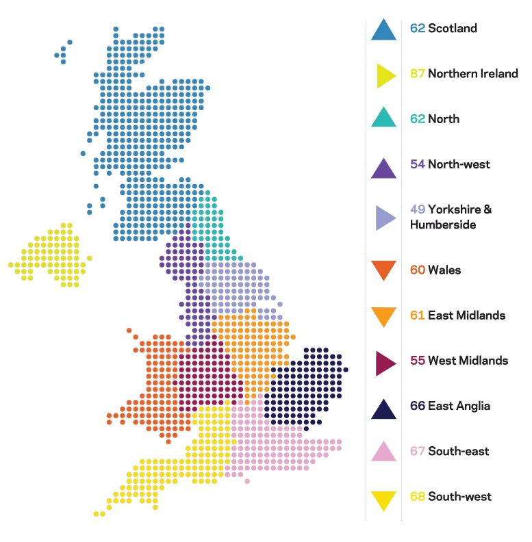 The North-east’s indicator climbed by five points to 62 and Scotland’s indicator rose by four points to also reach 62. An increase of three points took the North-west’s indicator to 54 and smaller increases of two points were recorded in the Eastern and South-east regions.