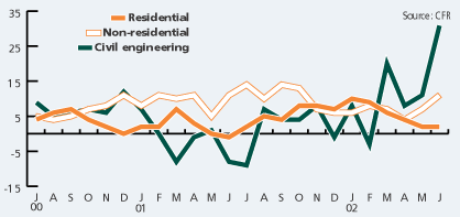 Data from the DTI shows that the volume of new construction orders was up 9% in the three months to May compared with the previous three months. Government spending is driving the increase, with orders in the infrastructure sector up 23% in the same three months compared with the previous period and 21% higher in the public non-residential sector. More unexpected was the contribution of the industrial sector, where the volume of orders rose 18%.