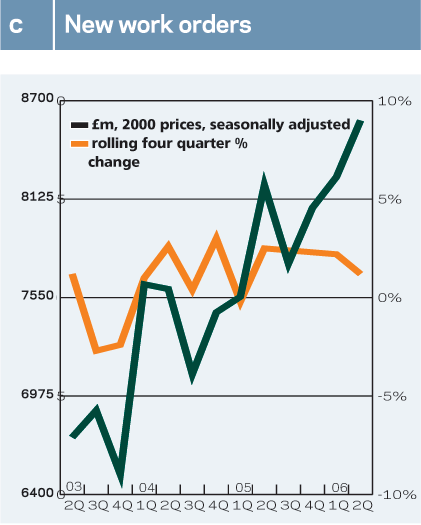 Focusing on the sectors, it is clear the current weakness lies on the public side. Activity in the private sector expanded strongly in the first half of 2006. Most notable was the acceleration in the rate of growth in commercial output, the UK’s largest sector in terms of value. Overall, however, the benefit of rising output in this and other private sectors was eroded by a decline in public non-housing new work output, and more acutely in public repair and maintenance work.