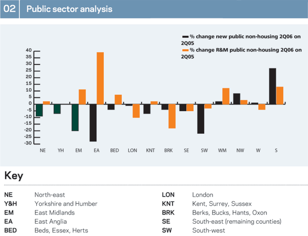 The chart (right) clearly shows the trend in public sector output is downwards. New public non-residential output suffered most in the second quarter of 2006, increasing marginally in three regions and rising substantially in Scotland, but declining elsewhere. The most significant declines in new work were seen in East Anglia, the South-west and the East Midlands. R&M output fared slightly better, expanding robustly in East Anglia, the East and West Midlands, Scotland and Bedfordshire.