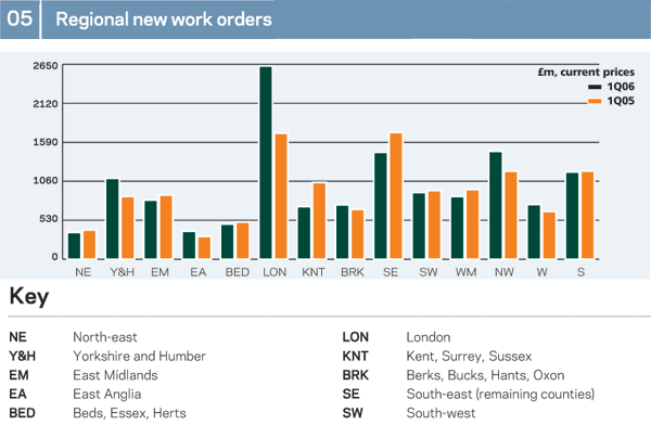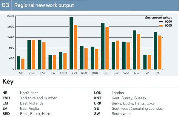 R&M output increased in 10 regions in 2Q06. East Anglia topped the league tables, with R&M output up 18% in 2Q06 from 2Q05. Apart from in East Anglia, rises in excess of 10% were also seen in Kent and the West Midlands. However, in contrast, R&M output declined in Yorkshire and Humber, the East Midlands, Berkshire and the North-west.