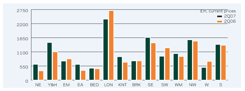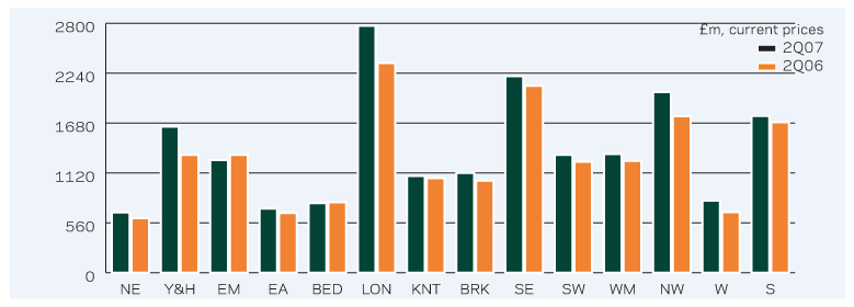 Year-on-year comparisons for new work varied considerably in the second quarter of 2007. Output was up strongly in Yorkshire (24%), the West (19%) and London (18%). For the East Midlands and Bedfordshire it was quite a different story. In the former, output was up £1.3bn, which is a 5% year-on-year fall. In the latter, new work output was down by 1%.