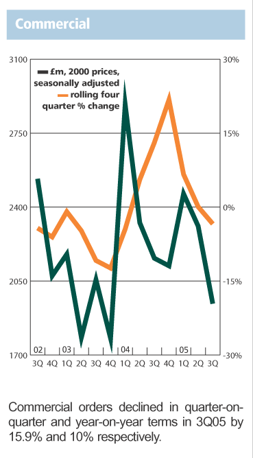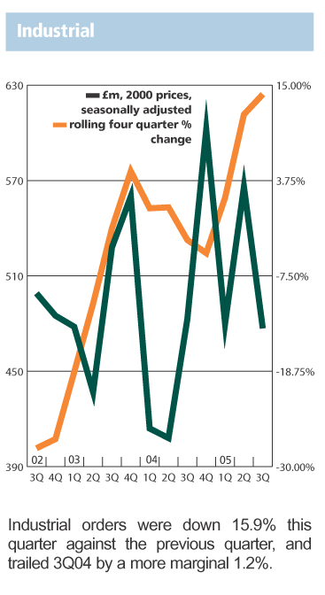 The latest data from the DTI shows that total orders, in current prices, in the UK in the third quarter of 2005 were 2% down on those in the second quarter of 2005, but 14% up from the third quarter of 2004.