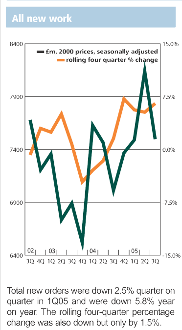 According to the latest figures from the DTI, total new work orders in the third quarter of 2005 were £7.5bn (2000 prices), down 7.9% on the previous quarter's figure of £8.1bn.