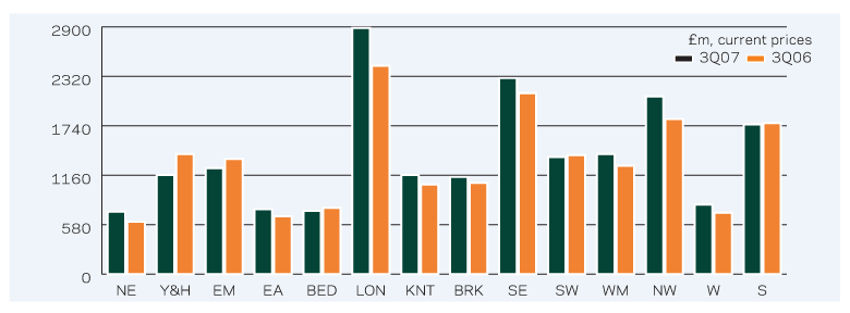 Orders rose most strongly in KNT – by 32% to £886m, in current prices. Growth of more than 20% year-on-year was also seen in SE and NE, and by more than 10% in NW, LON, WM and BRK. YH recorded more modest growth in new work orders of 7%. Orders fell from the third quarter of 2006 in EM, BED, SW and WM. but declined most sharply in S, by 37% to £879m, in current prices.