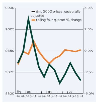 Public non-residential output continued to slide as the government tried to reconcile its ambitious public spending programme with lower than expected fiscal receipts. Output fell 5% in the first nine months and this followed a 5% contraction in 2006.