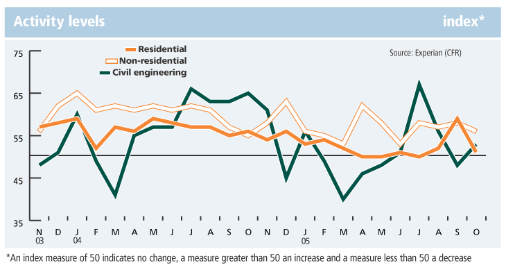 The Leading Construction Activity Indicator index fell to 53 in October after standing at 57 in September. Over the short term the indicator suggests construction activity will continue to expand and the index is forecast to stand at 55 in each of the coming three months.