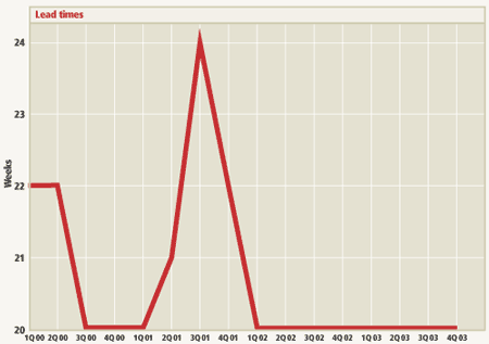 The raised flooring - (going down) sector reduced average lead times from eight to six weeks, a fall of two weeks. Firms are quieter than six months ago and this has eased pressure in design offices and factories.