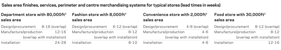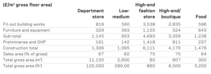 These typical costs for a range of store types exclude shell-and-core alterations, and focus on fit-out. The cost of direct supply items such as visual merchandise, tills and telephones are excluded as price varies depending on the retailer. Some retailers procure these items in bulk with large discounts and issue them to their contractors for installation; others prefer to buy through their contractors. The figures also exclude lifts and escalators (with the exception of department stores) and fees.