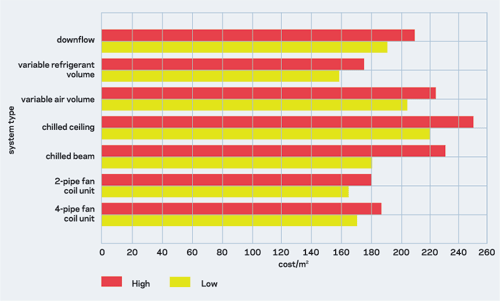 The elemental cost comparison chart, right, shows a typical range of costs for alternative air-conditioning types based on total current mechanical-only costs, excluding public health, fire protection, electrical services, preliminaries, professional fees, on costs, contingencies, design reserves and VAT.