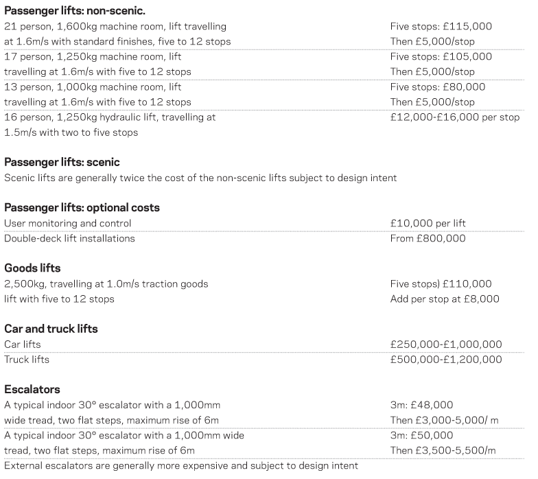 Lift, escalators and travelator costs: The costs given on the right are standard typical lift and escalator costs. Lift costs are determined by a number of categories, these being passenger capacity, speed of lift, number of floors being served, fire fighting, type of control, that is, machine room less, hydraulic, traction, internal and external finishes and the physical restrictions of the project. One person is taken to weigh about 75–80kg.
