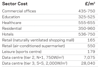 The following elemental cost range comparison shows typical mechanical and electrical costs across a number of key sectors, based on total day engineering services costs, and excluding preliminaries, professional fees, contingencies, design reserves and VAT.