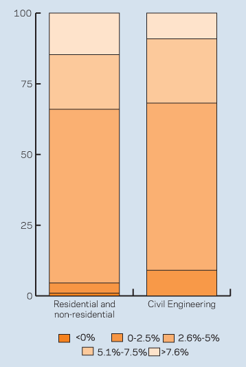 For nearly 15% of residential and non-residential firms, labour costs inflation over the year topped 7.6%. Only 9% of civil engineering firms reported increases of this magnitude – quite a contrast with last time when nearly 30% of respondents fell into this category.